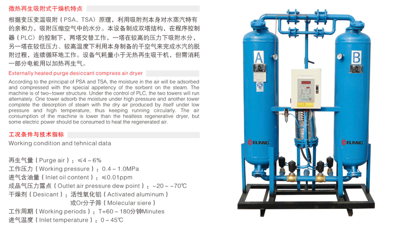 微热再生吸附式干燥机根据变压变温吸附(PSA\TSA)原理,利用吸附剂本身对水蒸气特有的亲和力,吸附压缩空气中的水分。本设备制成双塔结构,在程序控制器(PLC)的控制下,两塔交替工作,一塔在较高的压力下吸附水分,另一塔在较低压力、较高温度下利用本身制备的干空气来完成水汽的脱附过程,连续循环地工作。设备气耗量小于无热再生吸干机,但需消耗一部分电能用以加热再生气。