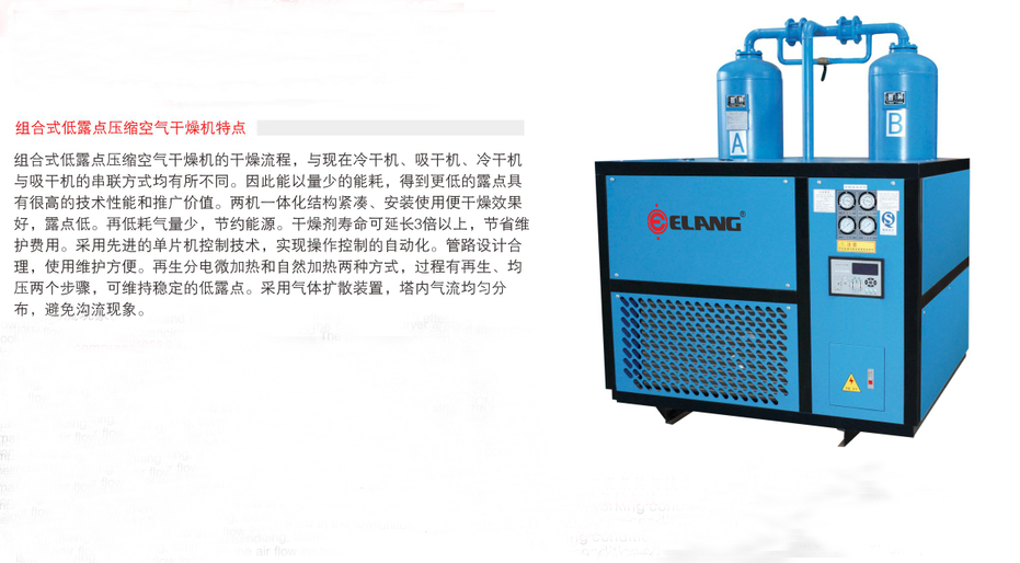 组合式低露点压缩空气干燥机的干燥流程,与现在冷干机、吸干机、冷干机与吸干机的串联方式均有所不同。因此能以量少的能耗,得到更低的露点,具有很高的技术性能和推广价值。两机一体化结构紧凑、安装使用方便、干燥效果好、露点低。再低耗气量少,节约能源。干燥剂寿命可延长3倍以上,节省维护费用。采用先进的单片机控制技术,实现操作控制的自动化。管路设计合理,使用维护方便。再生分电微加热和自然加热两种方式,过程有再生、均压两个步骤,可维持稳定的低露点。采用气体扩散装置,塔内气流均匀分布,避免沟流现象。