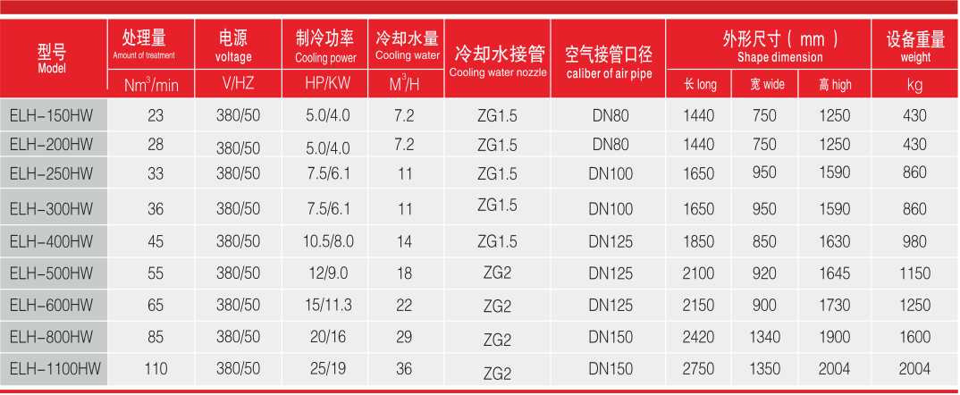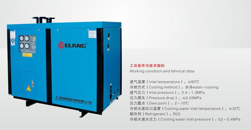 进气温度:≤80℃ 冷却方式:水冷 进气压力:0.4~1.3Mpa 压力损失:≤0.03Mpa 压力露点:2~10℃ 冷却水进出口温度:≤32℃ 制冷剂:R22 冷却水进水压力:0.2~0.4Mpa