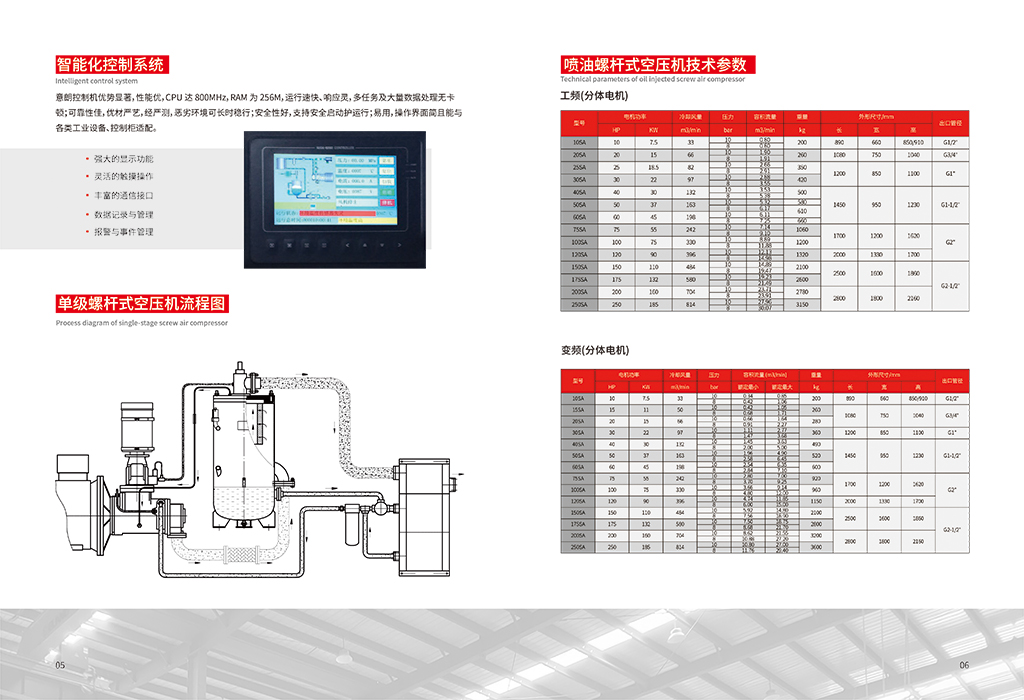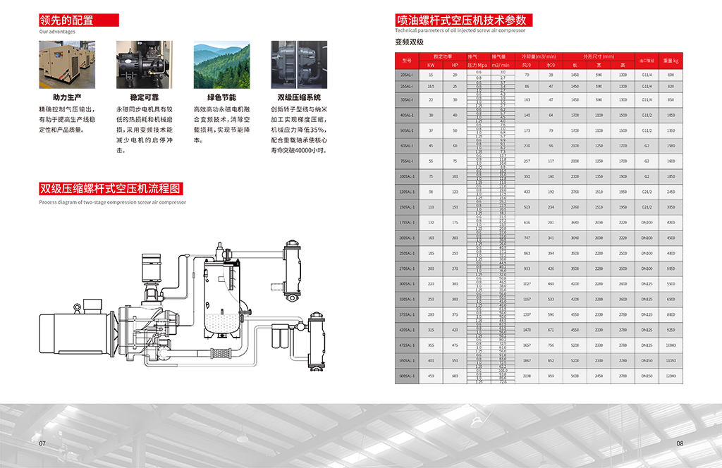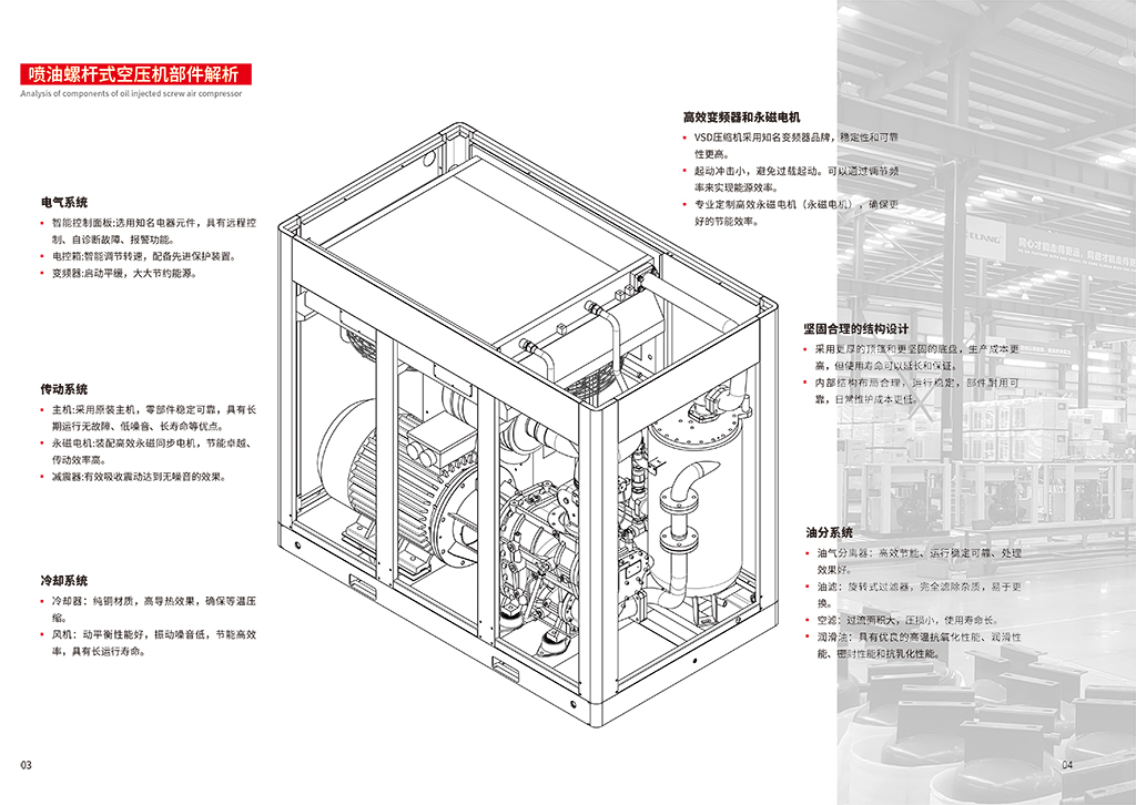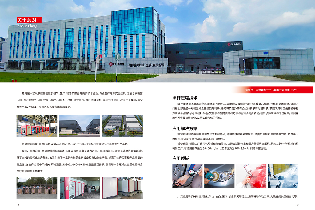 螺杆压缩技术 螺杆压缩技术隶属容积式压缩技术范畴,主要是通过机械结构的巧妙设计,达成对气体的高效压缩。该技术 的核心部件是一对相互啮合的螺旋形转子,通常将节圆外具有凸齿的转子称为阳转子,节圆内具有凹齿的转子称 为阴转子。阳转子与原动机相连,凭借原动机提供的动力带动阴转子同步转动。在转子持续转动的过程中,齿间容 积会发生规律性变化,从而实现气体的压缩。 应用解决方案 针对机械制造中频繁使用气动工具的特点,选用喷油螺杆式空压机。该类型空压机具有高效节能、产气量大 的特点,能满足多种气动工具同时运行的需求。 设备选型:根据工厂的用气规模和峰值需求,选择合适排气量和压力的螺杆空压机。例如,对于中等规模的机 械加工厂,可选用排气量为 10 - 20m³/min,工作压力为 0.8 - 1.0MPa 的螺杆空压机。